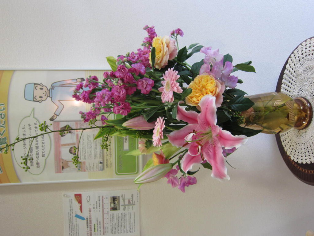 *1月の待合室のアレンジです。多くの花の種類を使って年明けの華やかさを表現しました*